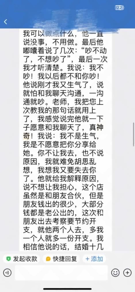 这位学员遭遇了沉重的打击,她老公在婚内出轨,小三甚至还生了一个女儿,这让他们的感情瞬间降至冰点。学员起初满心痛苦,对改变十分排斥,仿佛陷入了黑暗的深渊。但在我们的鼓励和引导下,她开始慢慢接受现状,并尝试做出改变。她努力调整自己,一点一点地进步。终于,她的付出有了回报,夫妻间的感情开始回升,家庭也有了重归温馨的希望。